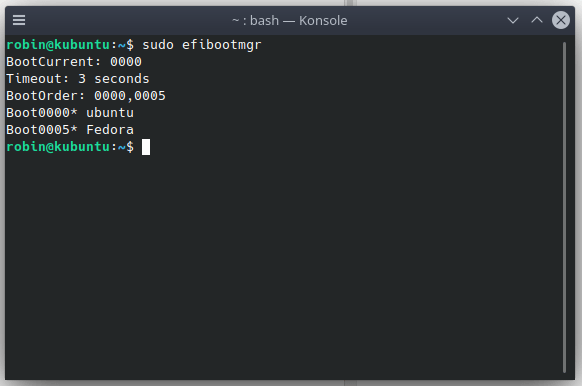 - Ubuntu is listed and marked as my primary bootloader, as the order I have is followed next by Fedora